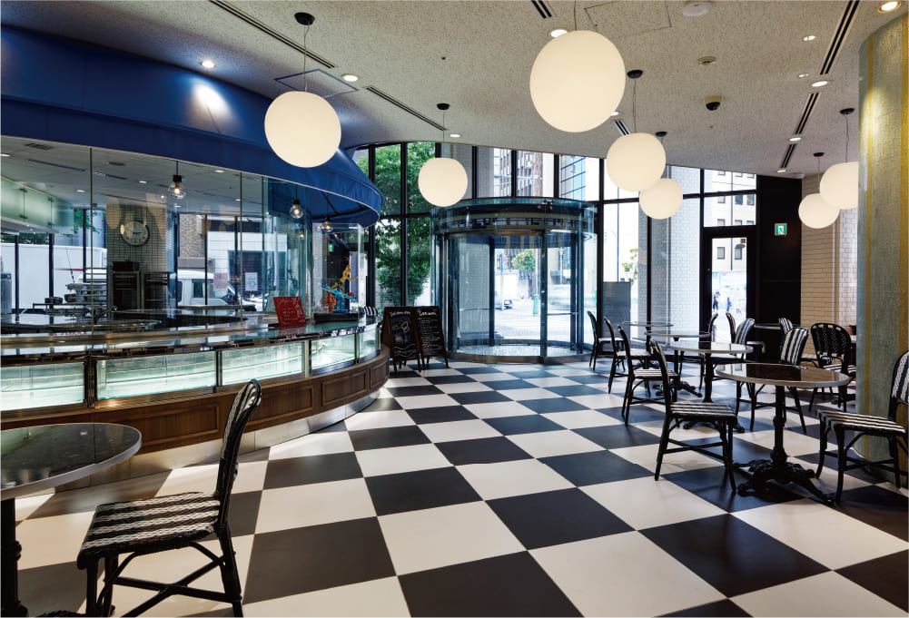 ガラス張りのオープンキッチンやフランスの街並みを再現したエントランス。