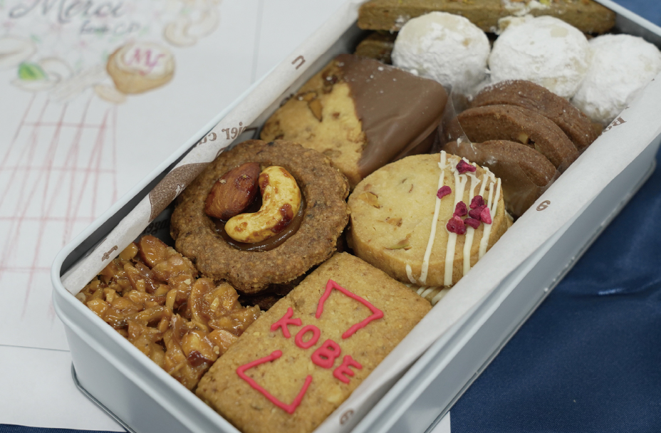 2023年度実施「神⼾をイメージしたクッキー⽸」をテーマに、(株)有⾺芳⾹堂 のナッツと増⽥製粉(株)の⼩⻨粉を使った商品開発に取り組みました。最優秀作品は「Merci」の商品名で、⼤丸松 坂屋神⼾店・(株)有⾺芳⾹堂直営店『NUTLAB』・『NUTLAB』オンラインストアで販売されました。